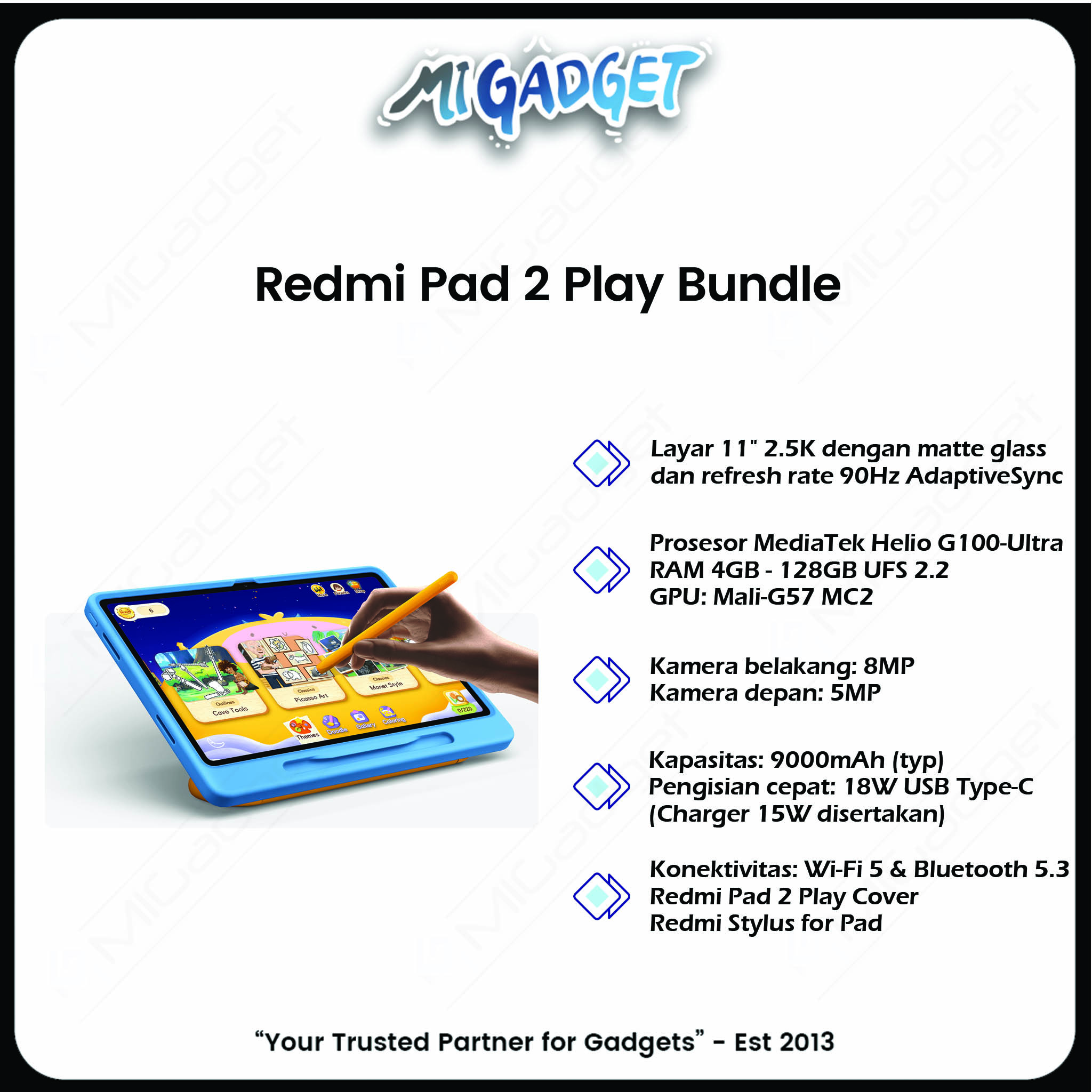Termasuk: Redmi Pad 2 Matte Glass Version, Redmi Stylus, dan Play Cover dalam satu bundle