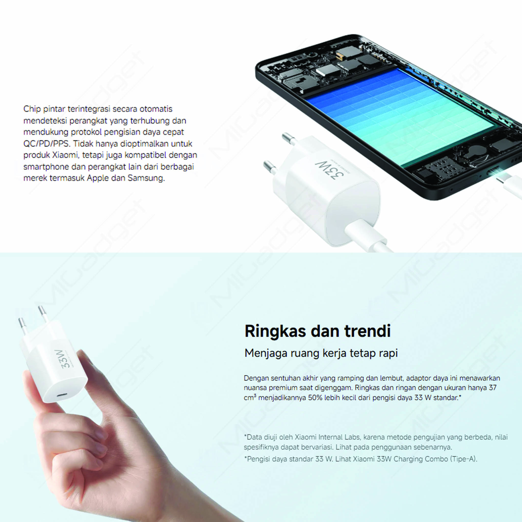 Ukuran hanya 37 cm³, 50% lebih kecil dari charger 33W standar—praktis untuk dibawa.